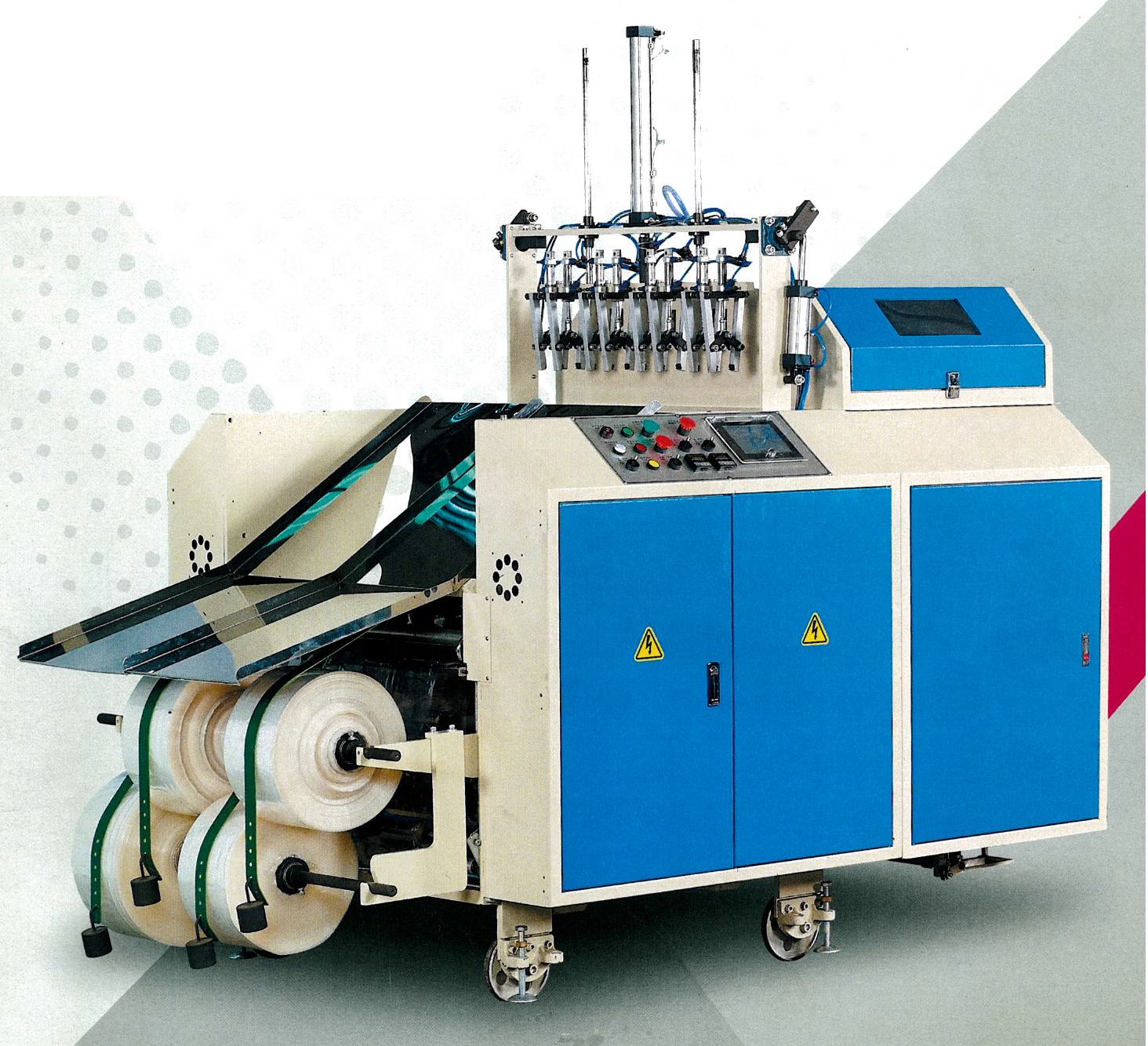 Эти машины специально спроектированы для массового производства пакетов типа «Маечка» с печатью из ПЭ. Машина производит одновременную сварку донного шва пакета и его отрез, что позволяет получать сварной шов исключительной прочности.